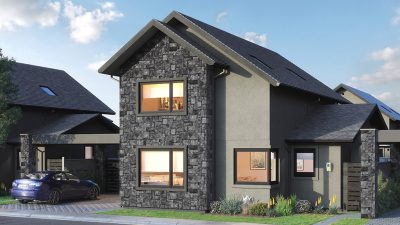 | Terminaciones | Pisos SPC en todos los recintos, excepto baños que consideran gres porcelánico. Ventanas de PVC negro con termopanel, calefacción central. |